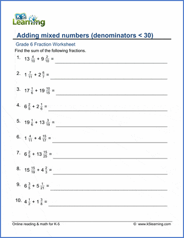 Students find the sum of mixed numbers by finding common denominators, adding the whole number parts and fractional parts separately, and then simplifying the result; denominators range from 0-30.