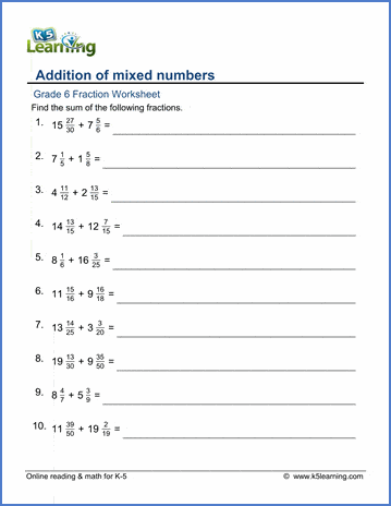 Students find the sum of two mixed numbers; denominators range from 0-60.