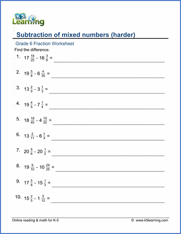 Students find the difference between 2 mixed numbers; denominators range from 2-60.