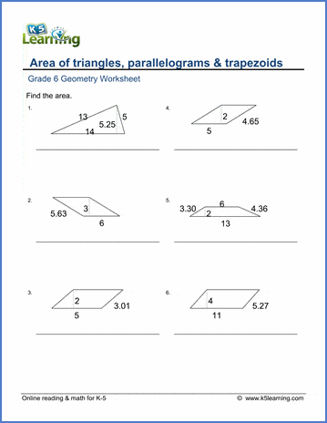 Grade 6 math worksheets on finding the area of various shapes including triangles, parallelograms, trapezoids, rectangular shapes and circles. The height of shapes is shown where required so that areas can be calculated without the use of trigonometry.