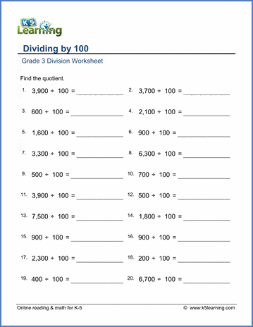 Our grade 3 math worksheet on dividing numbers (100-9,900) by 100. All quotients are whole numbers.
