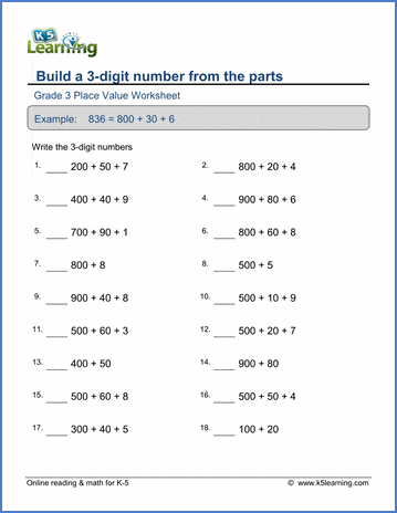 These grade 3 place value worksheets focus on building a 3-digit number from a combination of ones, tens and hundreds.