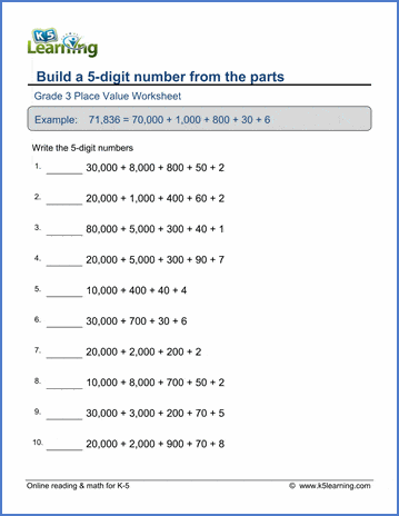 In these grade 3 math worksheets, students are given 5-digit numbers written in expanded form and rewrite it in normal form.