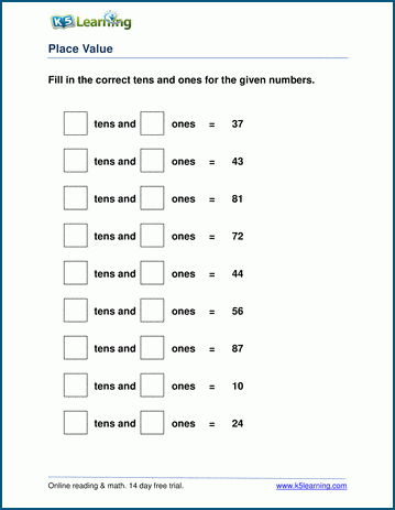 Our place value worksheets focus on deepening a student's understanding of our base 10 system. In our "base 10 blocks" worksheets, students manipulate blocks (units of 1) and rods (groups of 10) to build, deconstruct or add numbers. Later worksheets focus on building or de-constructing multi-digit numbers.