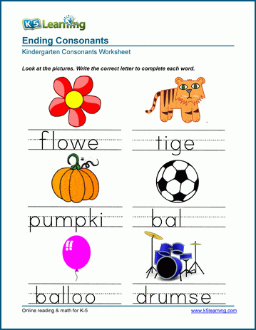 For students who are comfortable printing lower case letters, here they are asked to write the missing ending consonant for words as illustrated by pictures. No hints or "letter bank" are given, so these exercises are more challenging than the "matching" type exercise.
