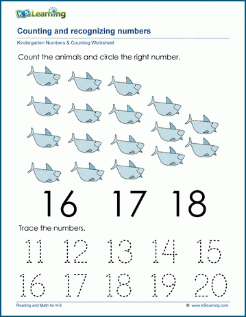 Count and recognize the number 18 Count and recognize the number 19Explore all of our learning numbers worksheets (recognizing and printing numbers), counting worksheets (counting objects, skip counting, counting backwards) and comparing numbers worksheets ("more than", "less than", ordering numbers).