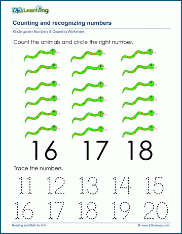 Count and recognize the number 19 Count and recognize the number 20Explore all of our learning numbers worksheets (recognizing and printing numbers), counting worksheets (counting objects, skip counting, counting backwards) and comparing numbers worksheets ("more than", "less than", ordering numbers).
