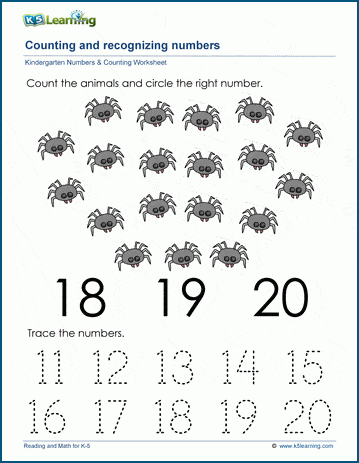 Count and recognize the number 20 Count and recognize the number 1Explore all of our learning numbers worksheets (recognizing and printing numbers), counting worksheets (counting objects, skip counting, counting backwards) and comparing numbers worksheets ("more than", "less than", ordering numbers).