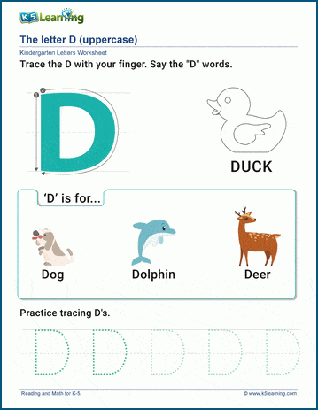 These worksheets introduce the letter D and give students practice in recognizing D's, using "D" words and writing D's. Both upper and lower cases are considered.