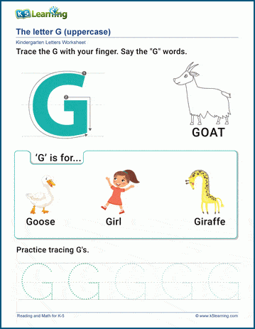 These worksheets introduce the letter G and give students practice in recognizing G's, using "G" words and writing G's. Both upper and lower cases are considered.