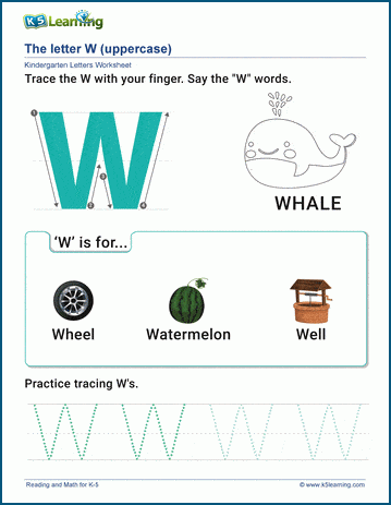 These worksheets introduce the letter W and give students practice in recognizing W's, using "W" words and writing W's. Both upper and lower cases are considered.
