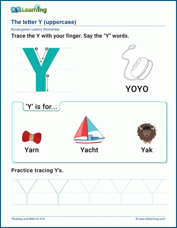 These worksheets introduce the letter Y and give students practice in recognizing Y's, using "Y" words and writing Y's. Both upper and lower cases are considered.