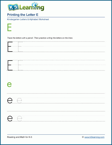 Students print the letter "E" in both upper and lower case. Practice until perfect with these printable worksheets.