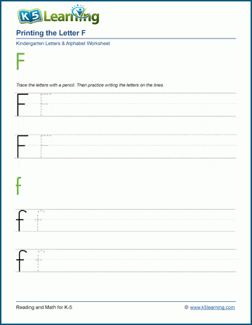 Students print the letter "F" in both upper and lower case. Practice until perfect with these printable worksheets.