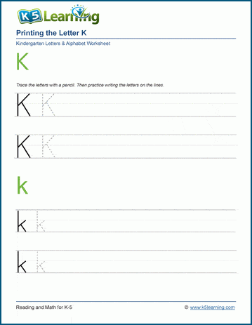 Students print the letter "K" in both upper and lower case. Practice until perfect with these printable worksheets.