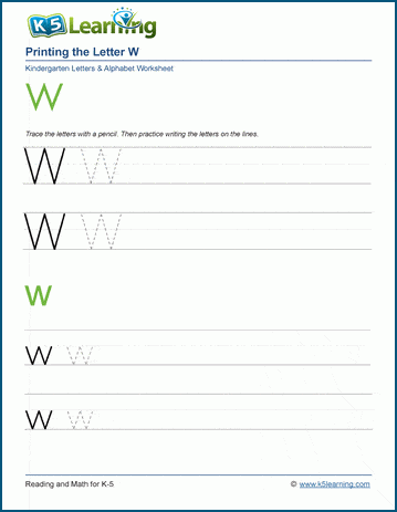 Students print the letter "W" in both upper and lower case. Practice until perfect with these printable worksheets.