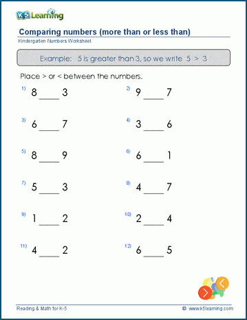 Students compare numbers with more than / less than / equal to symbols. The worksheets introduce the use of the symbols in direct comparison of numbers rather than groups of objects.