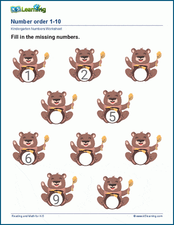 In these number sequencing worksheets, students write the numbers in order from 1-10. No tracing pattern is provided.