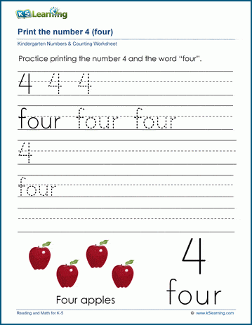 Worksheet #2Students practice tracing and printing the number four in both numeric ("4") form and as a word ("four").