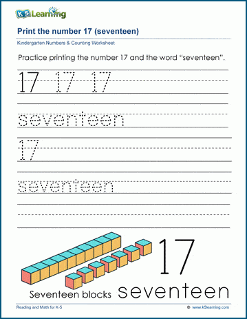 Students practice tracing and printing the number seventeen in both numeric ("17") form and as a word ("seventeen").