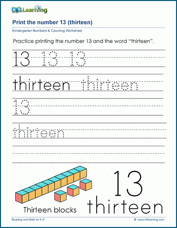 Worksheet #2Students practice tracing and printing the number thirteen in both numeric ("13") form and as a word ("thirteen").