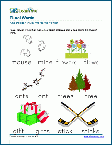 These kindergarten worksheets focus on identifying plural words. Students learn that plural words simply mean 'more than one' and are typically formed by adding an "s" to a noun.