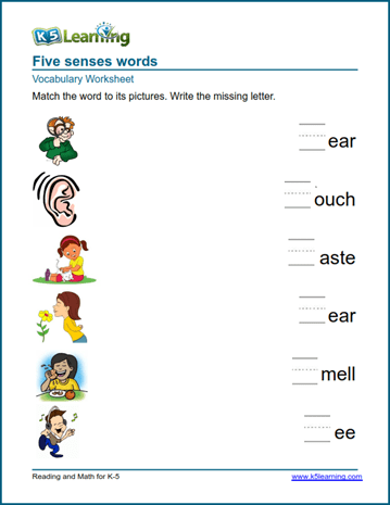 These worksheets cover words associated with the five senses: hear, smell, taste, touch and see. They cover hidden letters, matching pictures to words and writing the first letter of words.