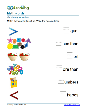 Students practice math words, such as add, count, odd, even. The worksheets cover hidden letters, matching pictures to words and writing the first letter of words.