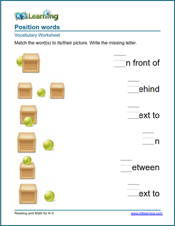 These worksheets help students practice position words: behind, next to, between, on, etc.