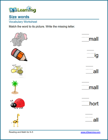 These worksheets cover words for sizes in hidden letters exercises, matching pictures to size words and writing the first letter of words.