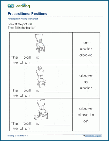 In these writing worksheets, students examine pictures then select and write the correct preposition to complete the sentence.
