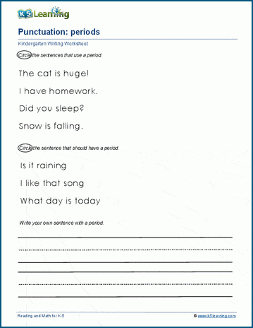 Periods go at the end of normal (declarative) statements. These worksheets give students practice identifying and using periods and differentiating between statements, questions and exclamatory sentences.