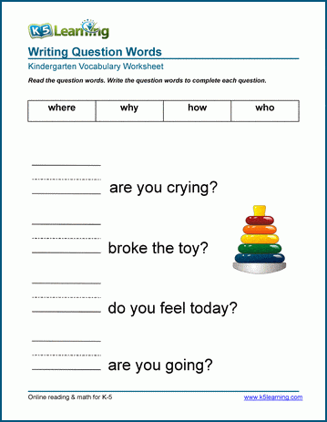 Like our other question word worksheets, these exercises emphasize understanding the difference in meaning between the common question words, but also include printing the words for further re-enforcement of spelling and usage.