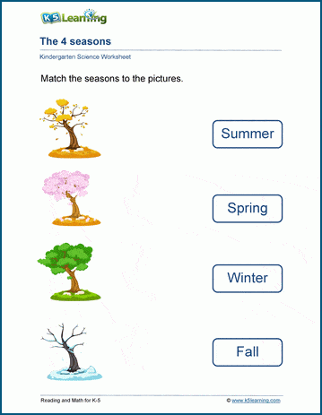 Students match the names of the seasons with pictures of nature or activities appropriate to that season. The intent of the worksheets is to demonstrate both that the seasonal changes occur as well as to help students learn the names of the seasons.