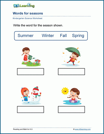 In these kindergarten worksheets, students write the words for the seasons. matching the seasons to pictures. The 3 worksheets give various levels of help to the student.