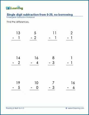 Math worksheets with vertical subtraction problems: numbers within 10, numbers within 20 and numbers within 20 (some borrowing). All subtrahends are single digit numbers.