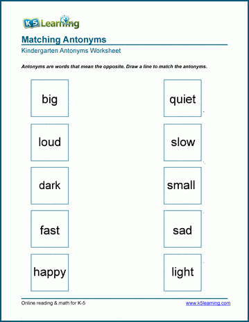An antonym is a word that means the opposite of another word. Knowing antonyms can help students express themselves better. In these worksheets, students are asked to match pairs of antonyms.
