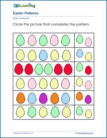 Students complete Easter patterns in these three worksheets, the first two in which students circle the picture that completes the pattern and the third in which students color Easter shapes to show the correct patterns.