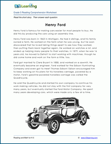 Henry Ford is a short story for kids in grade 5. Reading comprehension questions follow the story.
