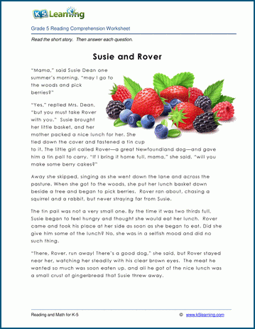 Susie and Rover is a short fable for grade 5 students, followed by reading comprehension questions.