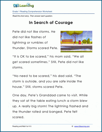 In Search of Courage is a short story about a boy who gets scared during a storm. Reading comprehension questions follow the story.
