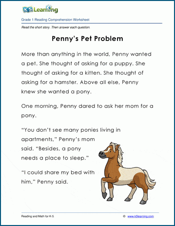 Penny's Pet Problem is a short story for kids about a girl who wants a pony but lives in an apartment. Reading comprehension questions follow the story.