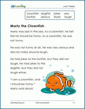 Marty the Clownfish is a sample story from our level F leveled reading workbook.
