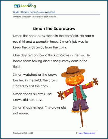 Simon the Scarecrow is a fable for grade 1 students, followed by reading comprehension questions.