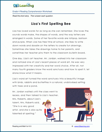 Liza's First Spelling Bee is a short story for kids in grade 4. Reading comprehension questions follow the story.