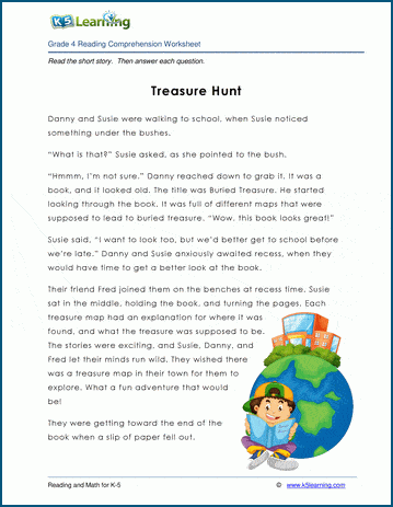 Treasure Hunt is a short story for kids in grade 4. Reading comprehension questions follow the story.