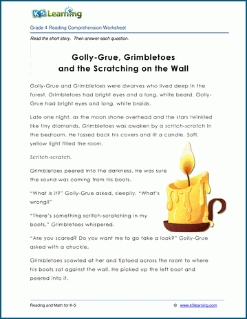 The Scratching on the Wall is a "Golly-Grue and Grimbletoes" story for grade 4 students, followed by reading comprehension questions.