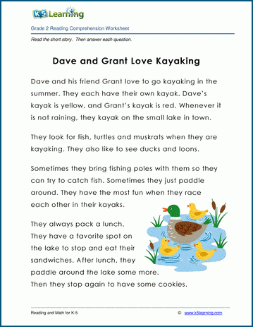 Dave and Grant Love Kayaking is a short story for kids in grade 2. Reading comprehension questions follow the story.