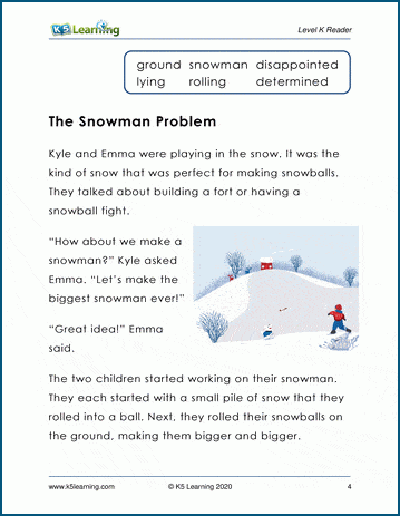 The Snowman Problem is a sample story from our level K2 leveled reading workbook.