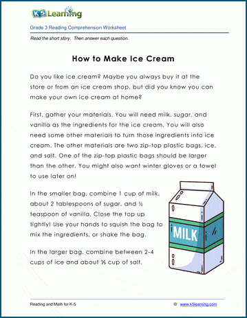 How to Make Ice Cream is a short story for kids in grade 3. Reading comprehension questions follow the story.